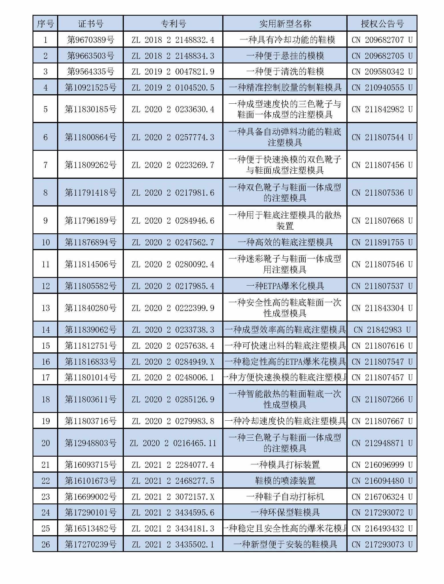 26個(gè)實(shí)用新型專利證書